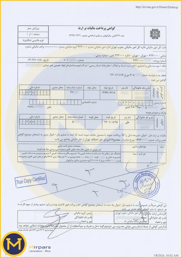 نحوه سفارش ترجمه گواهی مالیات بر ارث به میرپارس