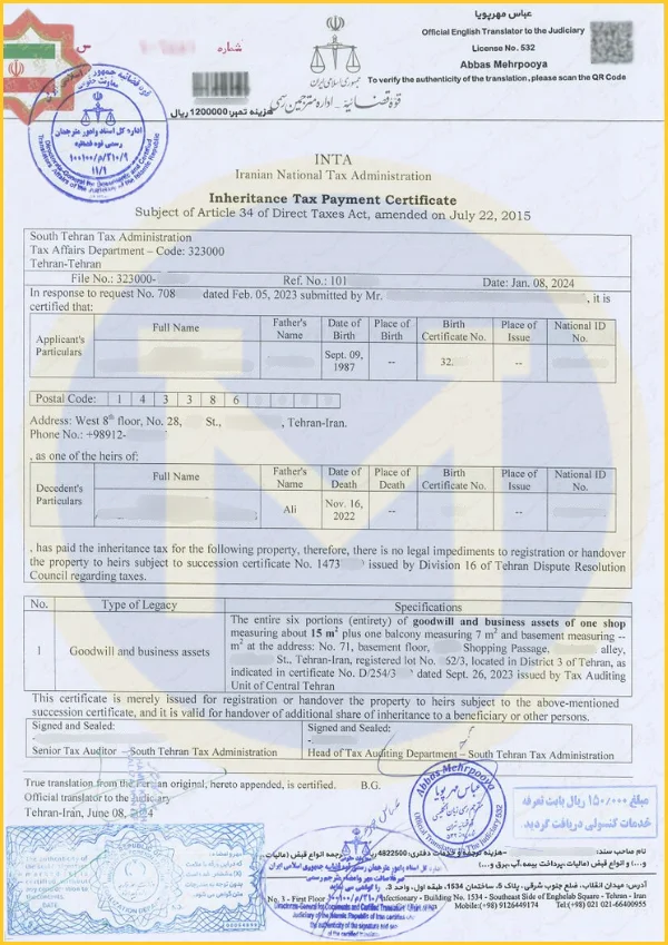 نمونه ترجمه گواهی مالیات بر ارث به انگلیسی